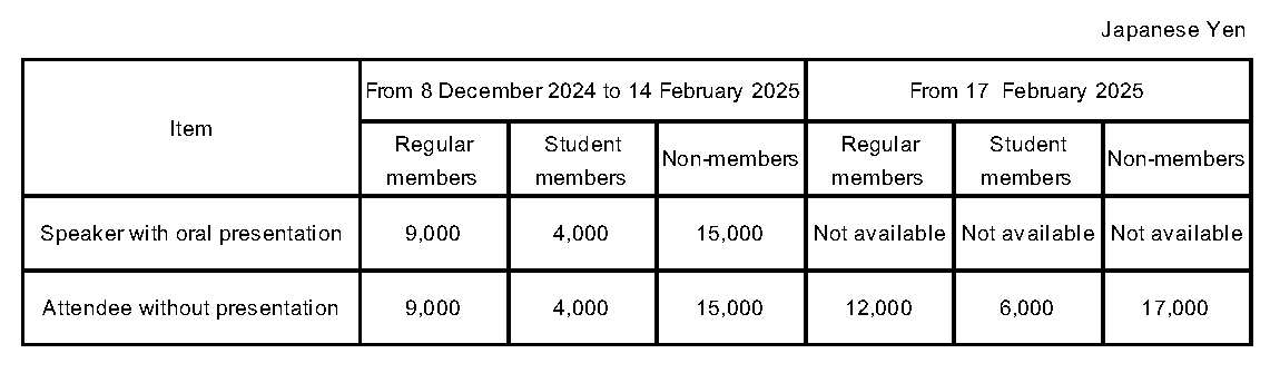 Participation fees vary depending on the type of participation and time of payment as shown in the following table. Members of JSFS and partnership societies (AFS, FSBI, KOSFAS, and CSF) are eligible to the discount rates as either regular or student members. All payments should be made by Credit Card and in Japanese Yen. Please note that the actual amount invoiced to your credit card may vary depending on currency exchange rates at the time of payment. Paper-based abstract book will not be provided to participants of this session (due to the cost of sending abroad). Please download the digital version of the abstract book after it is published online.