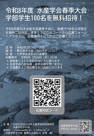 令和8年3月26日より日本水産学会春季大会が東京海洋大学品川キャンパスにて対面で開催されます。本大会でも,発表のない学部学生(大学1~4年生)および高等専門学校の学生(4・5年生)を無料で学会に招待します。つきましては,対象となる学生にご周知いただき,事前登録の上,ふるってご参加いただけますよう,ご協力のほどよろしくお願い申し上げます。